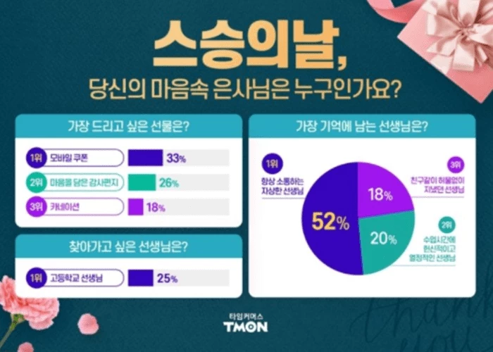 지난 5월 13일 티몬은 스승의 날을 앞두고 고객 500명을 대상으로 설문조사를 실시했습니다.