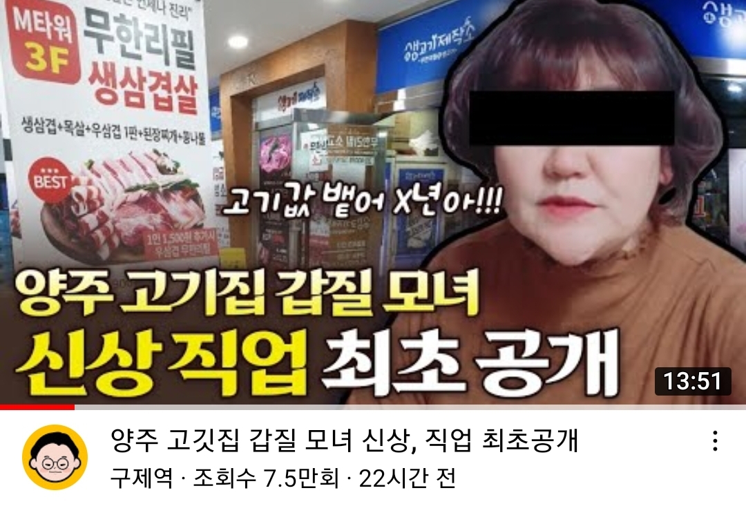 유튜브 구제역은 5월 29일`양주 고기집 갑질 모녀 신상, 직업 최초 공개`라는 동영상을 5월 29일 업로드했습니다.