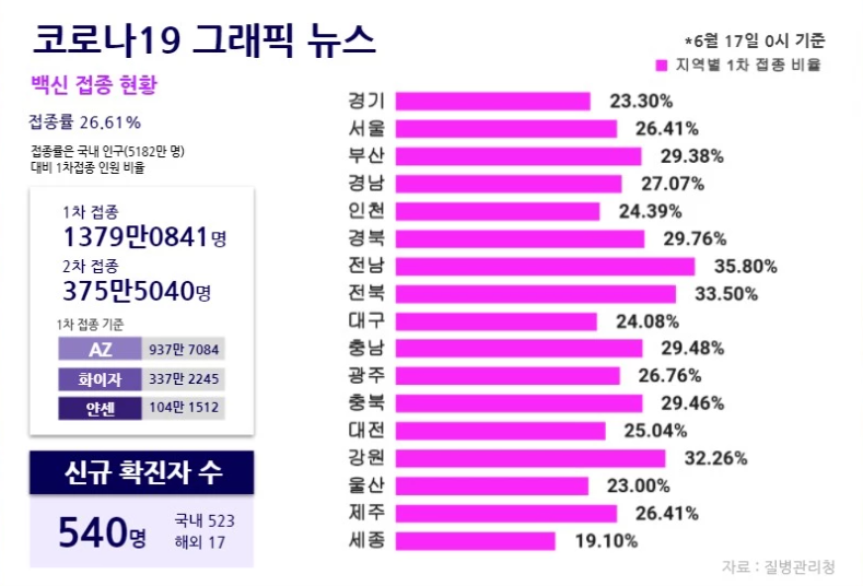 코로나 백신 예방접종 추진단은 6.17일 신규로 54만 248명이 백신을 접종받아 총 1379만 841명에 대한 1차 접종을 완료했고 1차 접종률은 26.9%라고 밝혔습니다.