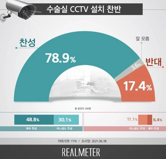 수술실에 CCTV를 설치하는 법안을 두고 민주당은 찬성, 국민의힘은 신중론을 펴는 가운데 YTN이 리얼미터에 의뢰해 수술실 CCTV 설치에 대한 의견을 물은 결과, 10명 가운데 8명은 찬성한다고 응답했습니다. 반대 의견은 17.4%입니다.