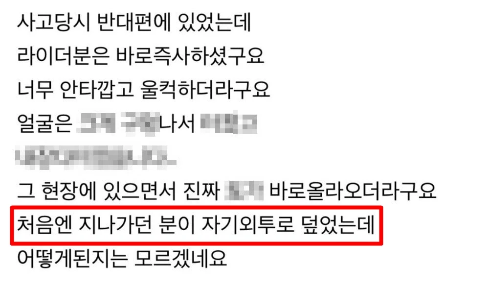 사고 목격자는 26일 네이버 카페 '배달세상'에 올린 글에서 "사고 당시 반대편에 있었는데 라이더분이 바로 즉사했다"라며 "너무 안타깝고 울컥했다. 처음에는 지나가던 분이 자기 외투로 (시신을) 덮었는데 (이후 현장 상황은) 어떻게 됐는지 모르겠다"라고 말했습니다.