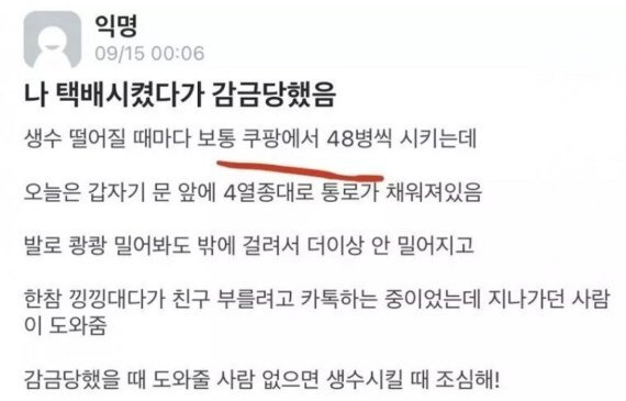 한 대학생이 쿠팡에서 생수 48병을 주문했다가 택배기사가 놓고 간 생수에 문이 안 열려 감금을 당했다는 사연을 올려 네티즌들간 갑론을박이 벌어졌습니다.