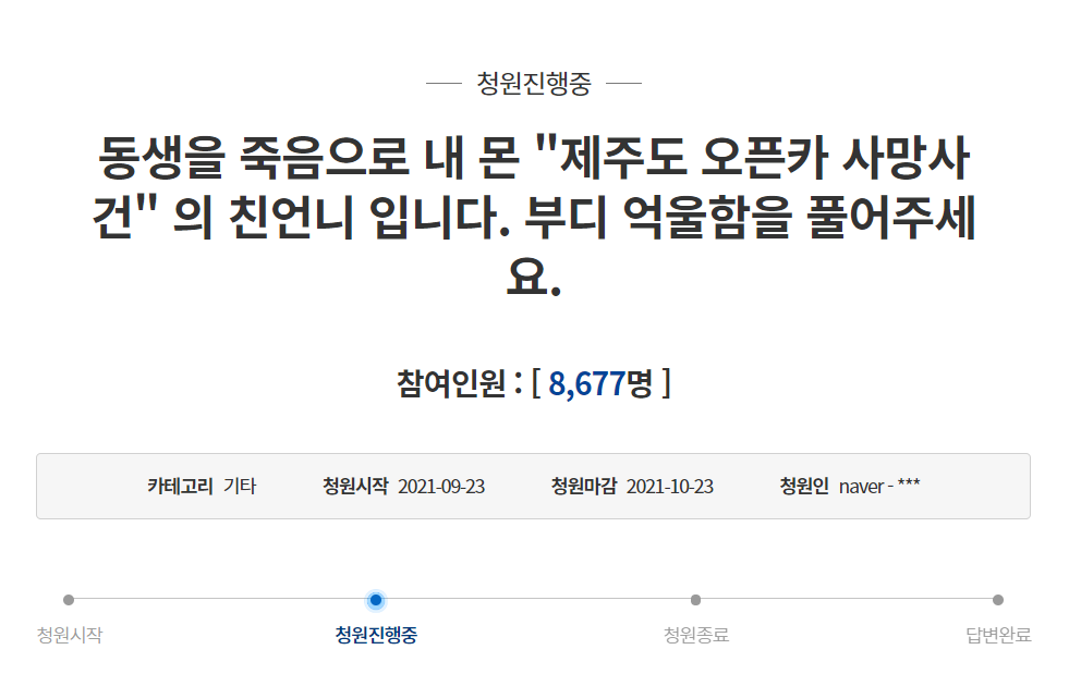 9월 23일 청와대 국민청원 게시판에는 “동생을 죽음으로 내 몬 ‘제주도 오픈카 사망사건’의 친언니 입니다. 부디 억울함을 풀어주세요”란 제목의 글이 게재됐습니다.