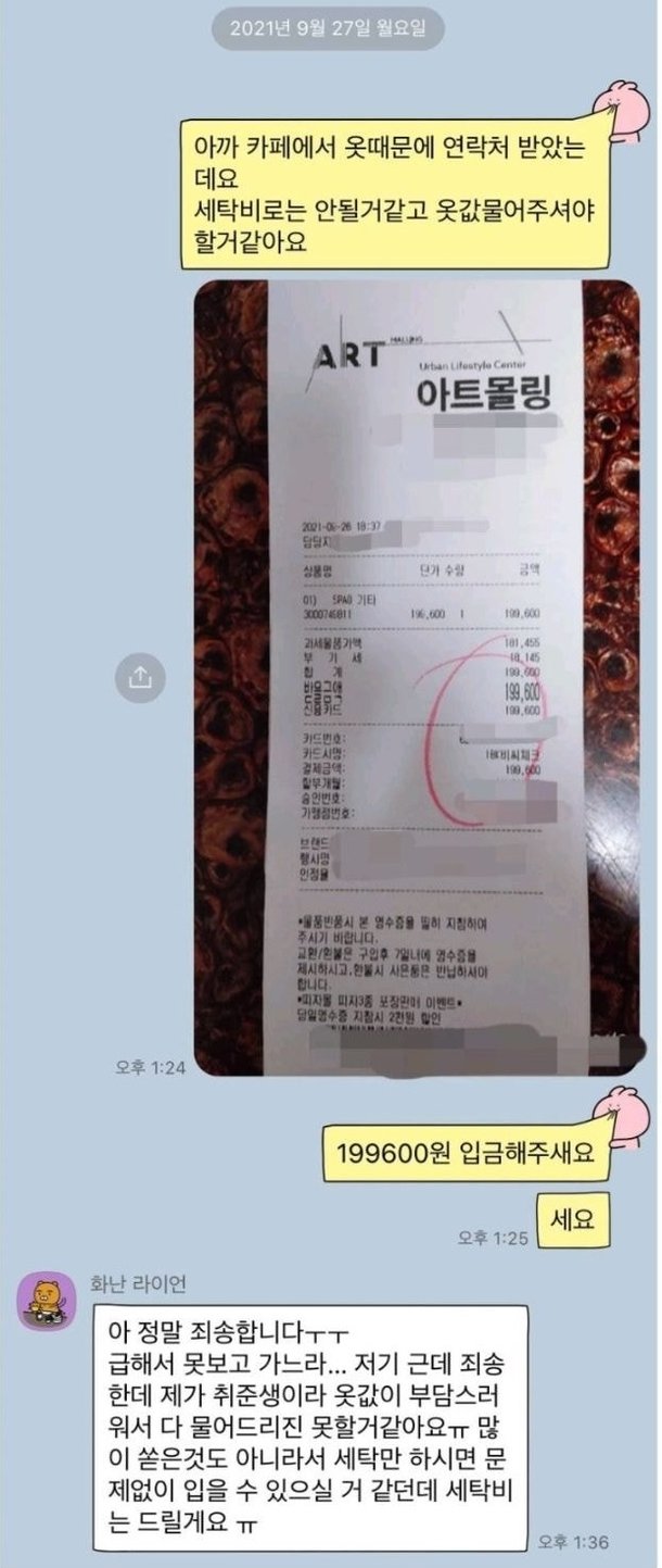 글에 첨부된 카카오톡 대화에 있는 영수증 사진에 따르면 옷값은 19만9600원으로 A씨는 커피를 쏟은 여성에 “세탁비로는 안 될 것 같다. 옷값을 물어달라”라고 했고, 여성은 “취준생이라 옷값이 부담스럽다. 세탁만 하면 문제없이 입을 수 있어 보이는데 세탁비 드리겠다”라고 답했습니다.