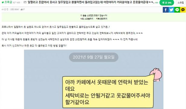 최근 직장에서 해고됐다고 밝힌 작성자 A씨는 27일 한 온라인 커뮤니티에 “돈이 없어 옷을 샀다가 일주일만 입고 환불하며 돌려 입고 있다”라며 “어떤 여자가 (입고 있는 옷에) 커피를 쏟았다”라고 했다. 이어 “그 여자가 급하다고 연락처만 주고 갔다”라며 “연락했더니 세탁비만 준다더라”라고 전했습니다.