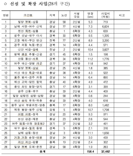 제천 봉양-원주 신림(국도 5호선) 구간은 충북 제천산업단지 등과의 연결성을 강화하기위해 4차로로 확장하고 경북 신도청 접근로인 국도 34호선 안동 풍산-서후 구간도 6차로로 확장합니다.