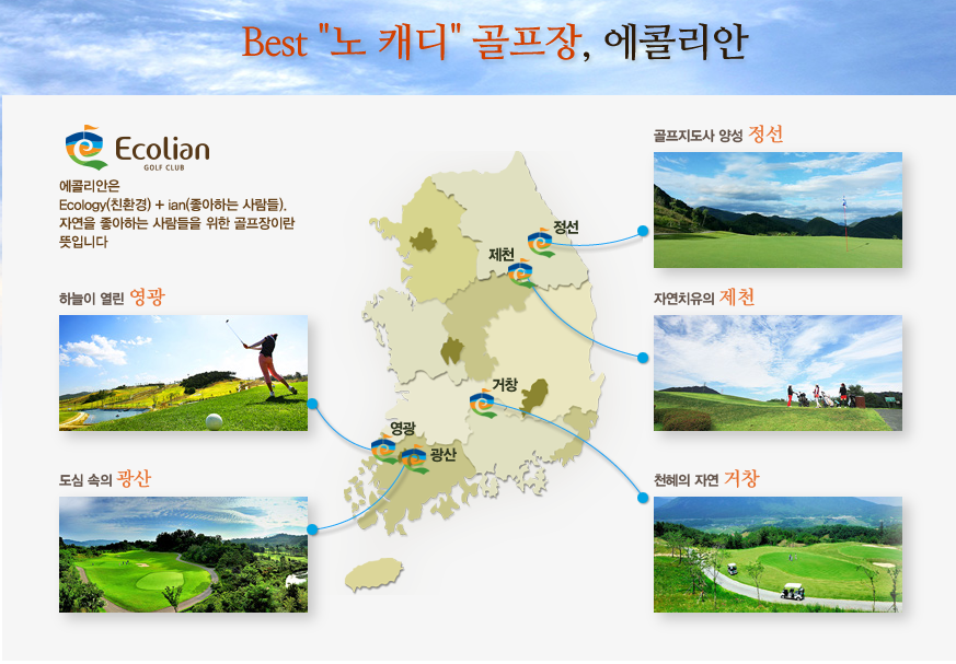 에콜리안 콜프장이란 Ecology(친환경) + ian(좋아하는 사람). 자연을 좋아하는 사람들을 위한 골프장이란 뜻입니다.