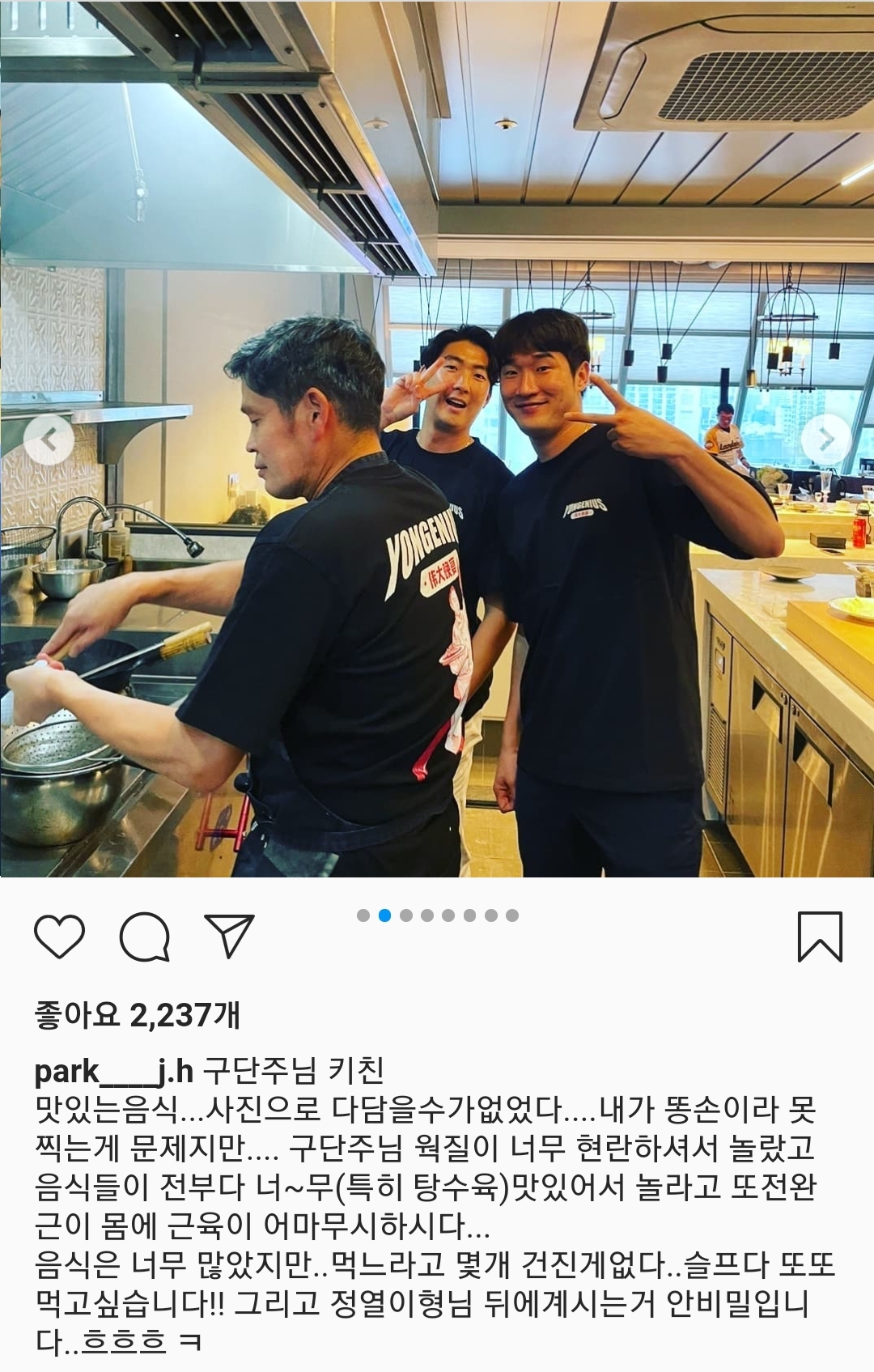 박 선수는 인스타그램에 "구단주님 키친. 맛있는 음식. 사진으로 다 담을 수가 없었다. 구단주님 웍질이 너무 현란해서 놀랐고 음식들이 전부 다 너~무(특히 탕수육) 맛있어서 놀랐다. 또 전완근이 몸에 어마무시하시다. 음식은 너무 많았지만..먹느라고 몇개 건진게없다..슬프다 또또 먹고싶습니다!!"고 적었습니다.