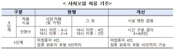 사적모임 기준은 단순화하고 접종 완료자에 대한 사적모임 제한을 완화합니다.