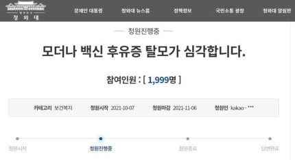 14일 청와대에 따르면 53세 남성 A씨는 지난 7일 국민청원 홈페이지에 모더나 2차 접종 이틀 후부터 머리가 빠지기 시작했다는 청원글을 게시했습니다.