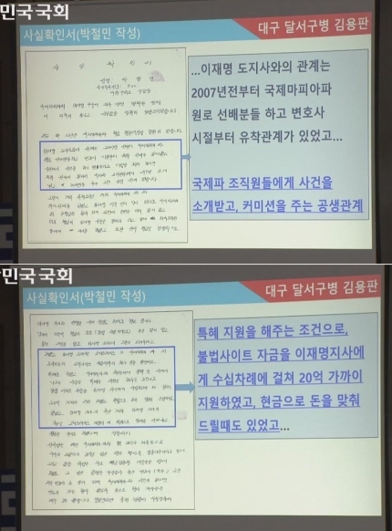 이날 국민의힘 김용판 의원은 경기도청에서 열린 국회 행정안전위원회 국정감사에서 박씨가 썼다는 사실확인서와 진술서를 공개하며 이 지사가 조직폭력배의 돈 20억원을 받았다는 주장을 제기했습니다.