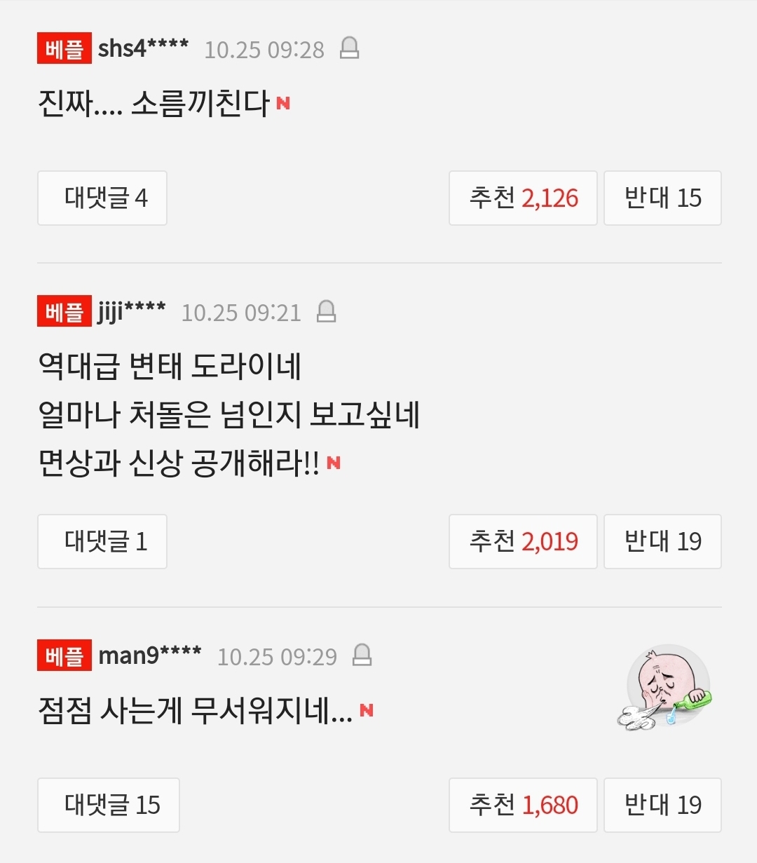 누리꾼들은 "진짜.... 소름끼친다", "점점 사는게 무서워지네... ","역대급 변태 도라이네 얼마나 처돌은 넘인지 보고싶네 면상과 신상 공개해라!!" 등의 댓글로 분노했습니다.