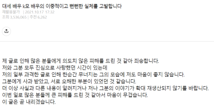 그러나 21일 B씨는 "당사자들끼리 서로 해결되었고 마무리된 상태에서 제3자가 끼어들면 일이 더 커질 것 같아 25일 폭로는 하지 않겠다"라고 입장을 번복했습니다.