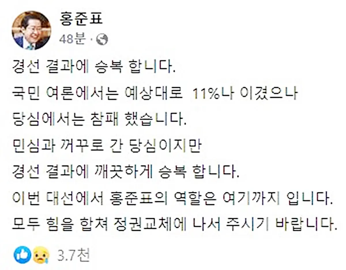 홍준표 의원의 낙선 소감이 지지자들의 마음을 울렸습니다.
