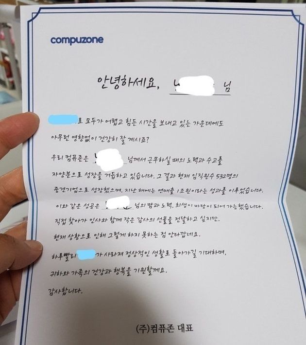 컴퓨존 대표(노인호) 이름으로 보낸 편지에는 “우리 컴퓨존은 A님이 근무할 때의 노력과 수고를 자양분으로 성장을 거듭하고 있다”며 “그 결과 현재 임직원수 532명의 중견기업으로 성장했으며, 지난해에는 연매출 1조원이라는 성과를 이뤘다”는 내용이 담겼습니다.