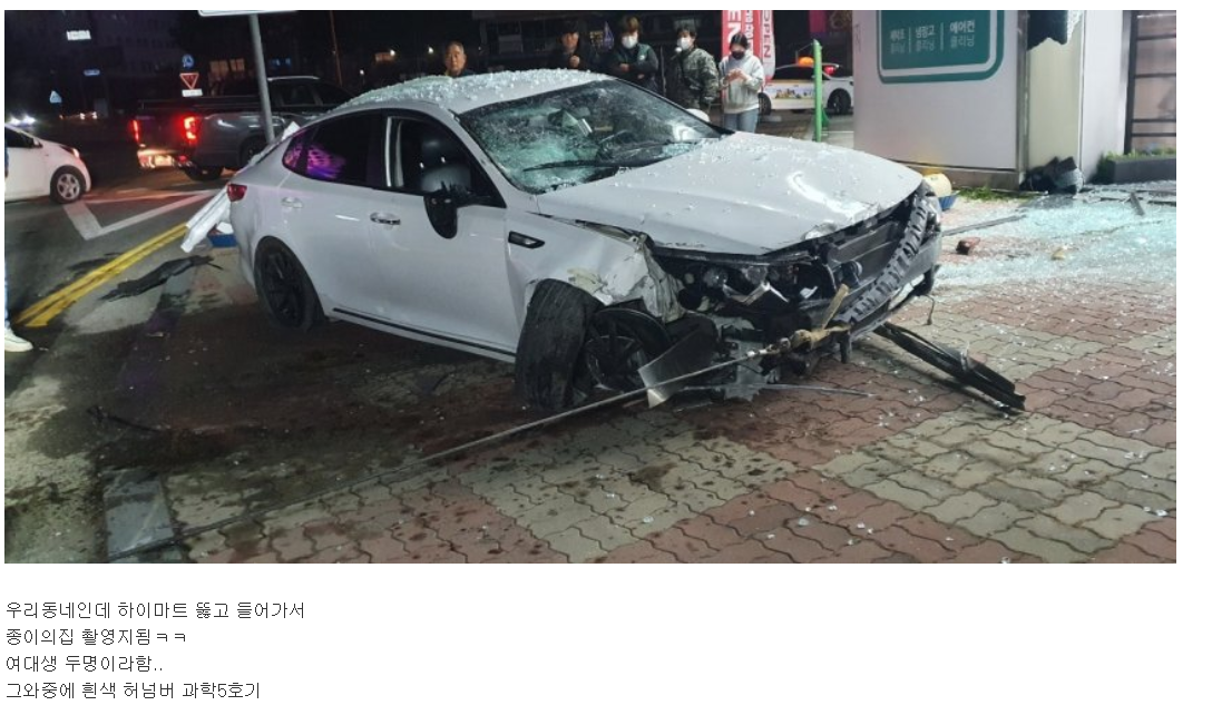 해당 네티즌은 "우리 동네인데 OO마트(가전제품 매장) 뚫고 들어가서 '종이의 집' 촬영지가 됨. 여대생 두 명이라고 함. 그와 중에 흰색, 허 넘버, 과학 5호기"라고 주장했습니다. 직접 촬영한 사고 현장 사진도 공개했습니다.