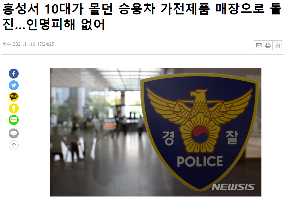 당시 사고와 관련해 뉴스시는 11월 16일 "홍성경찰서에 따르면 이날 0시께 홍성군의 한 회전교차로에서 A(18·여) 씨가 몰던 승용차가 가전제품 매장 안으로 돌진했다. 당시 A씨는 음주나 무면허로 운전하지는 않은 것으로 확인됐다. 다행히 인명피해는 발생하지 않았다. 경찰은 A씨가 렌터카를 빌려 친구인 B(18·여)씨와 함께 차를 타고 가다 회전교차로에서 운전 미숙으로 사고가 발생했다고 보고 정확한 사고 경위를 조사하고 있다"라고 보도했습니다. 사고를 낸 렌터카는 기아 K5로 알려졌습니다.