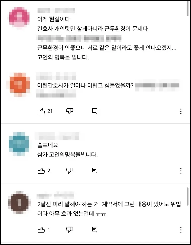 메시지를 본 누리꾼들은 안타깝다는 반응을 보였습니다. 유튜브 네티즌들은 "간호사 개인 탓이 아니다. 근무 환경이 문제다", "어린 간호사가 얼마나 어렵고 힘들었겠냐", "두 달 전 미리 말해야 하는 거 (근로)계약서에 그런 내용이 있어도 위법인데..."라고 댓글을 달았습니다.