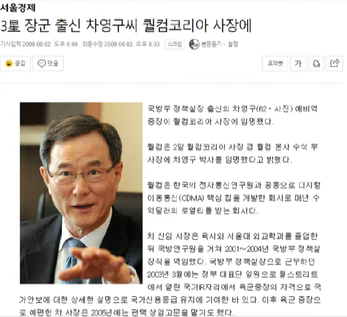 - 당시 조동연은 육사의 위탁교육을 통해 경희대 평화복지대학원 석사과정 대학원생으로 공부를 하고 있었습니다. 그런데 이 평화복지대학원 석사과정에 차영구가 겸임교수로 재직하고 있었고 차용구는 육사 26기로 광주 출신이며 중장으로 전역 후 펜텍 등에서 고문으로 일하다가 2010년 7월에 퀼컴 코리아 대표로 부임하게 됩니다.