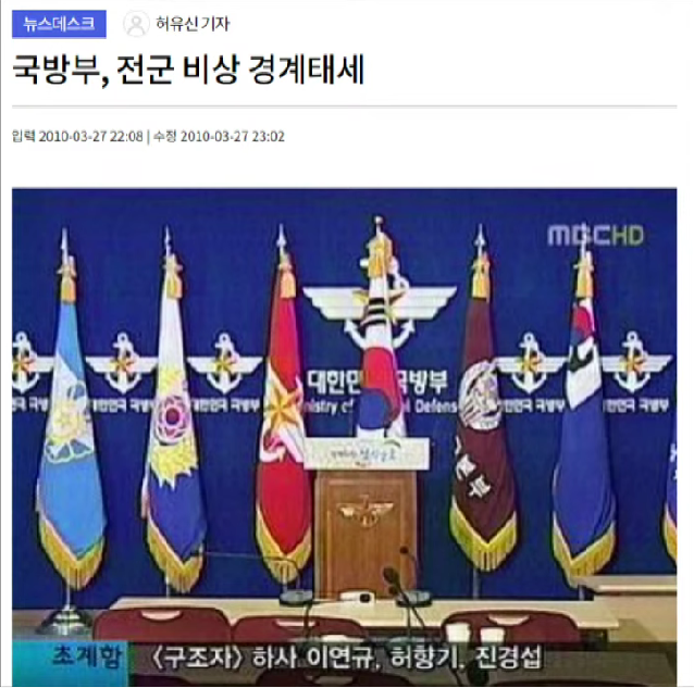 2010. 3. 26(금) 21:22분경 백령도 서남방 2.5Km 해상에서 경계 임무수행 중이던 해군 제2함대사 소속 천안함(PCC-772)이 북한 잠수정의 기습 어뢰 공격으로 침몰하여, 승조원 104명 중 46명이 전사하고 58명이 구조된 「국가 안보차원의 중대한 사태」 발생 [출처: 대한민국 해군]