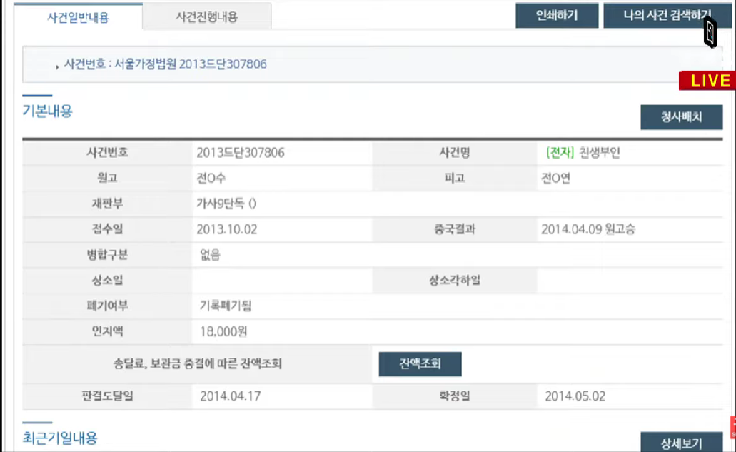 가세연은 판결문도 가지고 있다고 주장하며 재판 송무 기록만 공개했습니다.