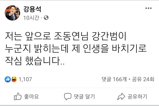 앞서 강용석 변호사는 “조동연님 강간범이 누군지 밝히는 데 인생을 바치기로 작심했다”고 작심발언했습니다.
