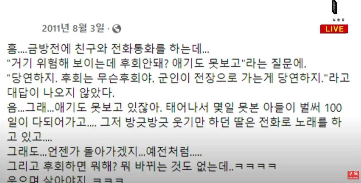 가세연은 A 씨가 조 교수와 결혼 생활 중 아프가니스탄으로 파병을 가 있을 당시 페이스북에 썼던 글 일부를 공개했습니다.