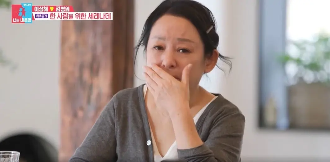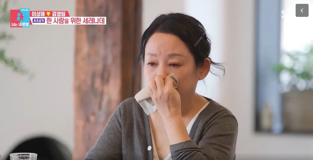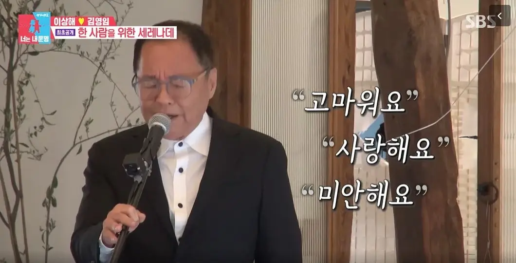 이상해는 아내에게 바치는 세레나데라며 본인 노래 '행복한 고백'을 불렀습니다. 노래 시작부터 김영임 표정은 어두워졌고 그는 내내 눈물을 훔쳤습니다. 남편을 바라보지도 않았습니다.