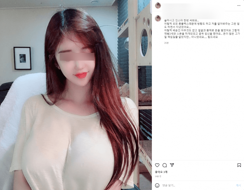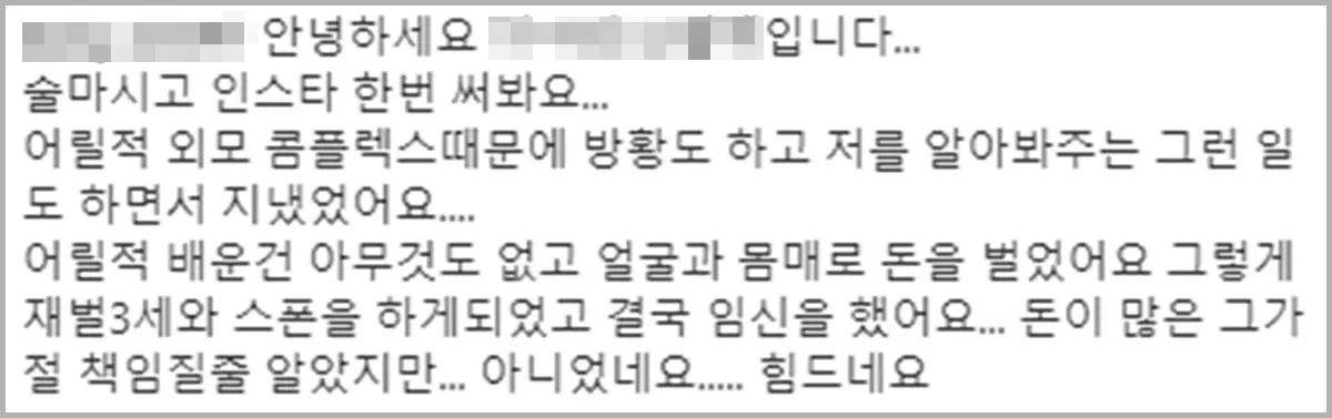 “안녕하세요, 술 마시고 인스타그램 글 한 번 써봐요. 어릴 적 외모 콤플렉스 때문에 방황도 하고 저를 알아봐주는 그런 일도 하면서 지냈어요. 어릴 적 배운 건 아무 것도 없고 얼굴과 몸매로 돈을 벌었어요. 그렇게 재벌 3세와 스폰을 하게 됐고 결국 임신을 했어요. 돈이 많은 그가 절 책임 질 줄 알았지만 아니었네요. 힘드네요.”