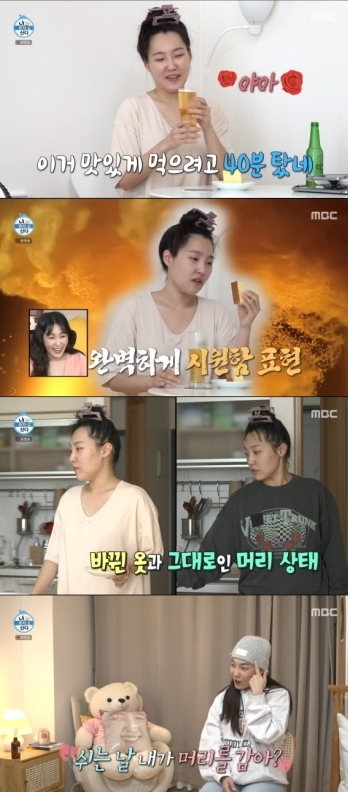 이은지는 설거지도 안 하고, 머리도 안 감는 모습을 보였습니다. 이은지는 "전 진짜 쉬는 날 머리 안 감는다"며 "쉬는 날 머리를 감는 건 정말 자존심 상한다"고 말했습니다. 박나래가 "나도 그렇다"며 공감하자, 전현무는 "넌 왜 일하는 날에도 안 감지 않냐"며 면박을 줬습니다.