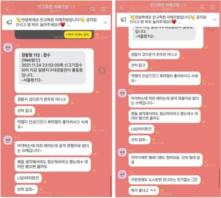 이어 "마약 하고 여자친구 때려놓고 음악 못할 이유 없다는 XXX다. 팬들 생각해서라도 정신 차리라고 했다"며 "대마초만 했으면 몰라도 LSD까지 한 건 선처 없다. 마약 구매한 텔레그램 캡처본도 있다. 이런 짓 해도 뉴스 한번 안 나오는 인기 없는 XX 뭐가 좋다고"라고 주장했습니다.