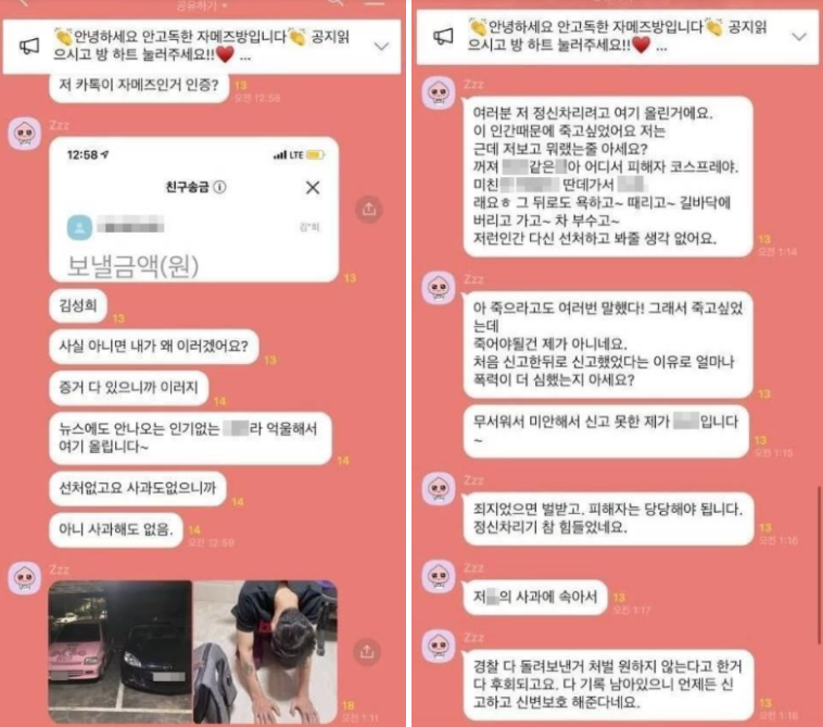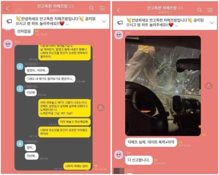 A씨가 공개한 사진은 충격, 그 자체였습니다. 자메즈로 추정되는 남성은 A씨 앞에서 무릎을 꿇고 있었고 한쪽 팔에는 문신이 보였습니다. 또 자메즈 인스타그램에도 자주 등장했던 핑크색 차량 사진과 차 유리창이 깨진 사진도 게재했습니다.