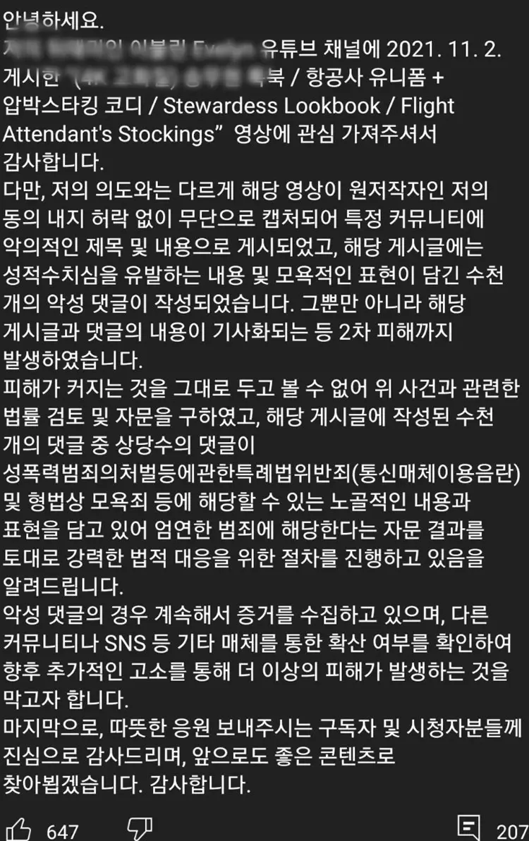이후 비난이 거세지자 지난 15일 "저의 의도와는 다르게 해당 영상이 원저작자인 저의 동의 내지 허락 없이 무단으로 캡처되어 특정 커뮤니티에 악의적인 제목 및 내용으로 게시됐다. 성폭력 범죄의 처벌 등에 관한 특례법 위반죄 및 형법상 모욕죄 등에 해당할 수 있는 노골적인 내용을 담고 있어 강력한 법적 대응을 위한 절차를 진행하고 있음을 알려드린다"라고 고소를 예고했습니다.
