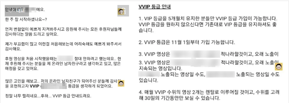 공개된 메일에서 룩북녀 이블린은 "제가 부끄럼이 많고 이런 걸 처음 해보는데 어리숙해도 예쁘게 봐 달라. 후원 영상을 처음 시작했을 때는 지난친 수위의 영상을 안 하려고 했는데 현재는 후원해 주시는 분들을 제 온라인 남자 친구라고 생각하고 있다. VIP 등급을 5개월 유지하면 VVIP 등급 가입이 가능하다"라고 설명했습니다.