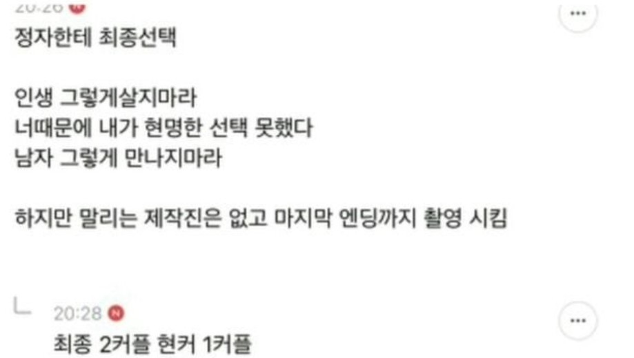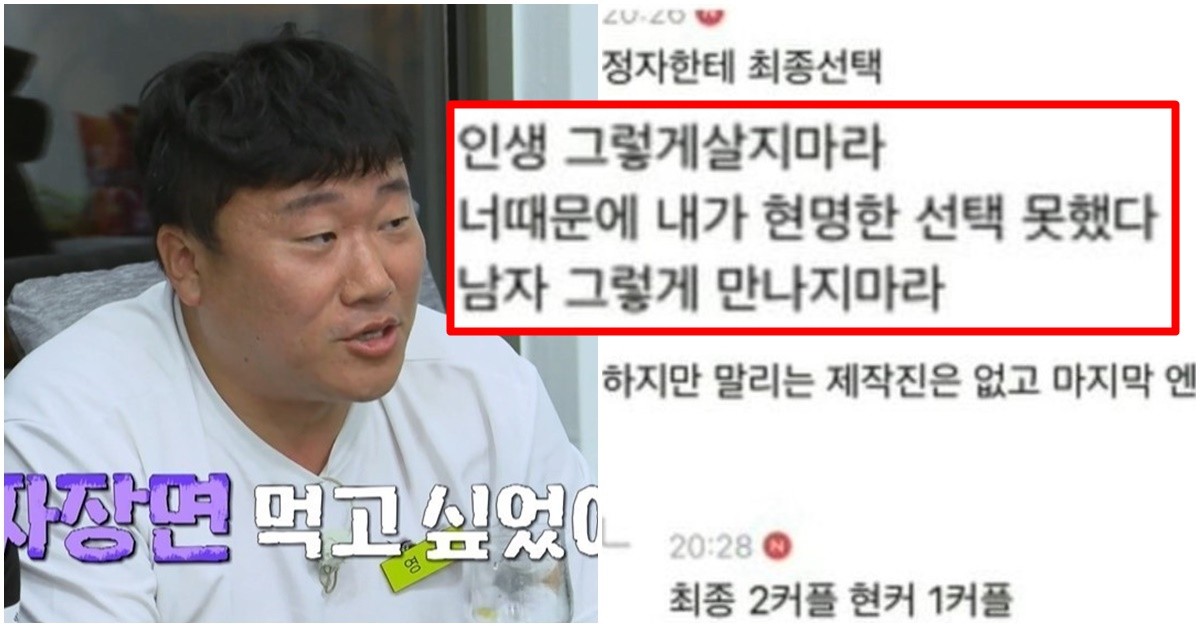 그는 논란을 빚은 영철에 대해 "정자한테 최종 선택(하면서) 인생 그렇게 살지 마라, 너 때문에 현명한 선택 못 했다 (말했다)"며 "하지만 말리는 제작진은 없고 마지막 엔딩까지 촬영 시킴"이라고 적었습니다.
