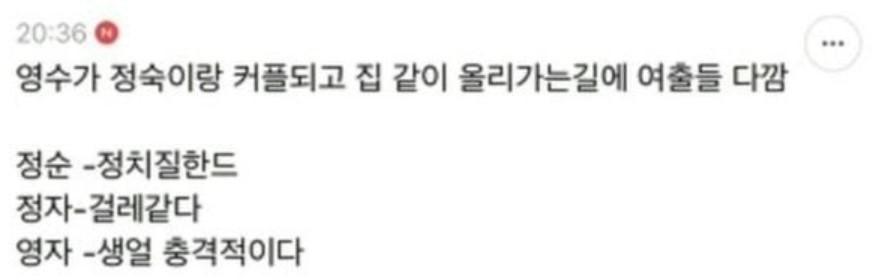이 외에도 "영식 부산에서 여자 소개팅 많이 받아서 고르는 걸로 유명하다", "3:1 데이트 후 4명 편의점 갔는데 영식이 4/1(4분의 1 오기로 보임) 하자 했음", "영수가 커플되고 집 올라가는 중에 여출들 다깜" 등 내용도 있었습니다.