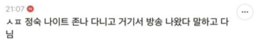또 "정숙 첫날부터 단체 앞에서 섹드립 쳤다", "정숙 나이트 XX 다니고 거기서 방송 나왔다고 말하고 다님" 등의 발언을 하기도 했습니다.