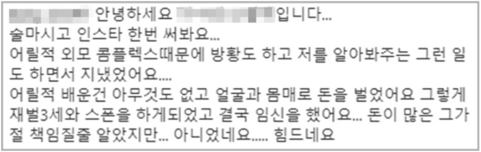 “안녕하세요, 술 마시고 인스타그램 글 한 번 써봐요. 어릴 적 외모 콤플렉스 때문에 방황도 하고 저를 알아봐주는 그런 일도 하면서 지냈어요. 어릴 적 배운 건 아무 것도 없고 얼굴과 몸매로 돈을 벌었어요. 그렇게 재벌 3세와 스폰을 하게 됐고 결국 임신을 했어요. 돈이 많은 그가 절 책임 질 줄 알았지만 아니었네요. 힘드네요.”
