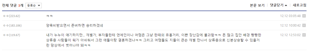 누리꾼들은 "양육비받으면서 존버하면 승리하겠네", "내가 누누이 얘기하지만... 재벌가, 부자들한테 연예인이나 여캠은 그냥 한때의 유흥거리, 이쁜 장난감에 불과함ㅋㅋ 돈 많고 집안 배경 빵빵한 상류층 사람들이 뭐가 아쉬워서 그런 애들이랑 결혼하겠냐ㅋㅋ 그리고 여캠들도 지들이 큰손 재벌 만나서 상류층으로 신분상승할 수 있을거란 망상에서 벗어나야 돼ㅋㅋ" 등의 비난 댓글이 달렸습니다.