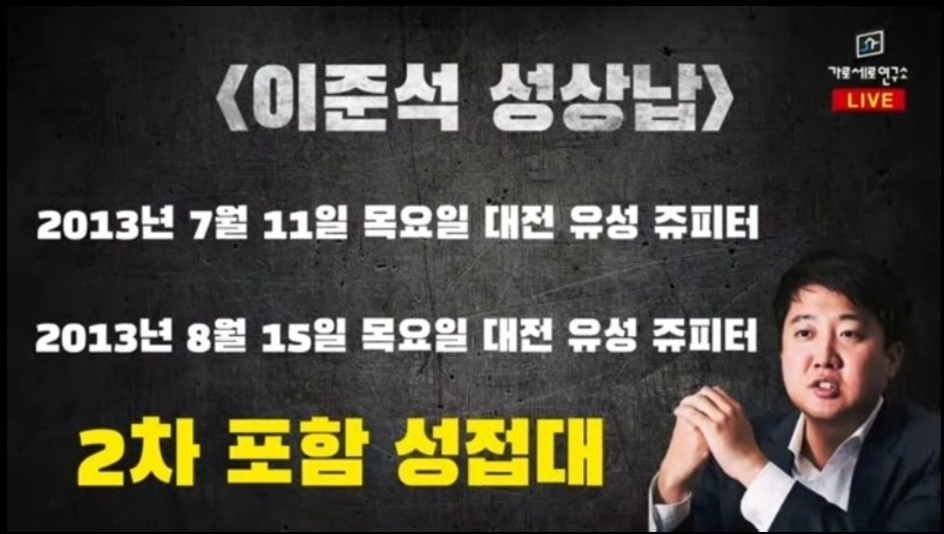 유튜브 채널 가로세로연구소(이하 가세연)는 12월 27일 이준석 국민의힘 대표가 박근혜 정부 시절 한 기업 대표로부터 성상납을 받았다고 주장했습니다.
