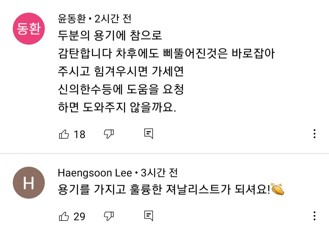 이 영상에 "두 분의 용기에 감탄합니다", "훌륭한 저널리스트가 되세요" 등의 댓글이 달렸습니다.