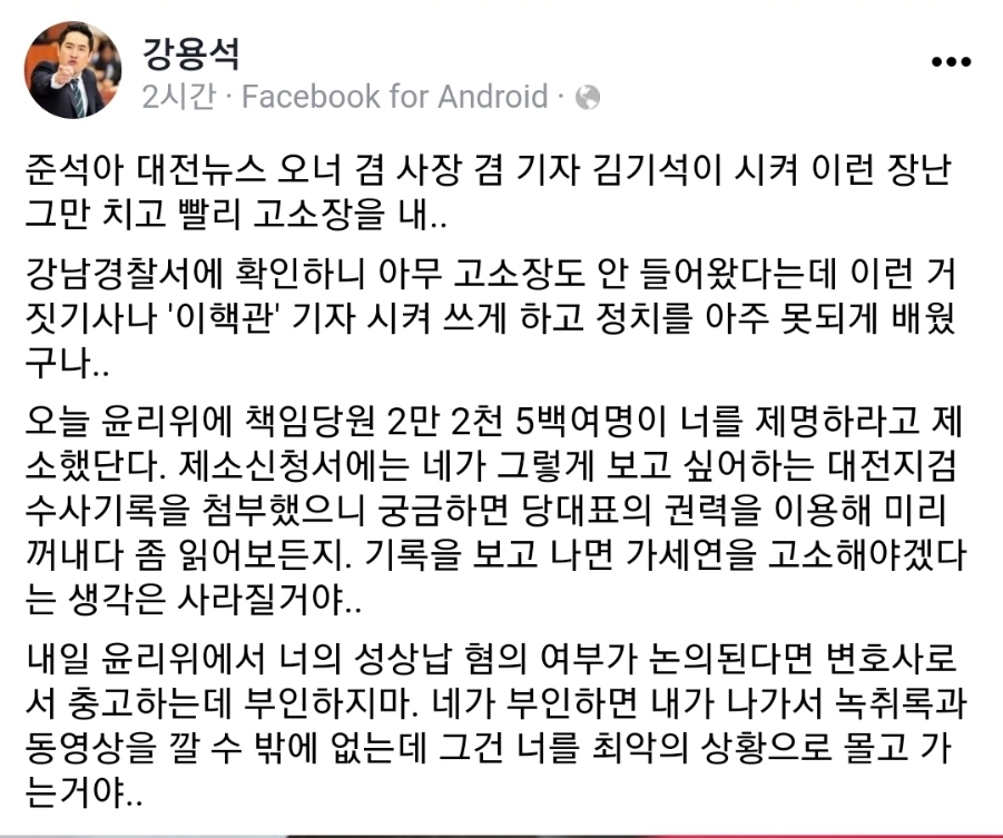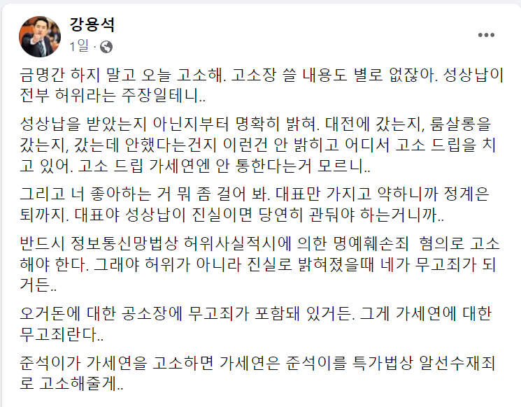 강 변호사는 12월 28일 오후 페이스북에 이 대표를 겨냥한 글을 올렸습니다. 강 변호사는 “금명간 하지 말고 오늘 고소해. 고소장 쓸 내용도 별로 없잖아. 성상납이 전부 허위라는 주장일 테니”라고 적었다. 강 변호사의 글은 모두 반말 어투로 작성됐습니다.
