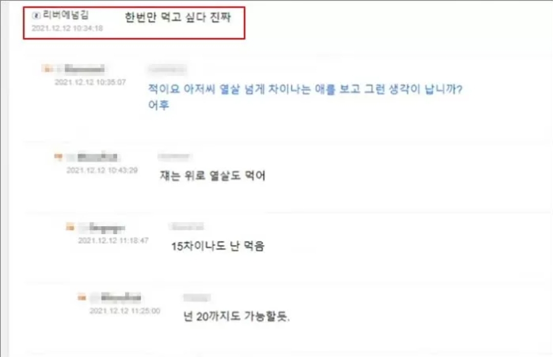 한 유저가 에스파의 카리나에 대해 게시글을 쓰자 리버에넘김이 "한 번만 먹고 싶다, 진짜"라는 댓글을 달았습니다.