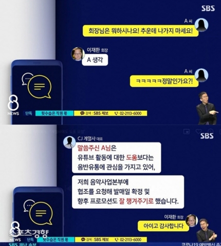 SBS에 따르면 이재환 회장은 자신과 사적 내용의 메시지를 주고받은 가수에 대해 CJ그룹 계열사 대표에게 음반 유통 지원 등을 요청했고, 이 대표는 “협조를 요청해 향후 프로모션도 잘 챙겨주시고 했다”고 답했습니다.