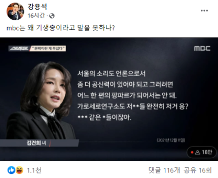 이어 그는 "제일 웃긴건 MBC"라며 "이명수 통화 녹음이 '서울의 소리'에 나왔으면 7시간 45분을 전부 올렸어도 기사 하나도 안 나고 끝났을 텐데, 결국 엄청나게 바람잡아 김건희 씨 홍보방송 해준 꼴이 됐는데 계속 자살골만 넣고 있다"라고 덧붙였습니다.