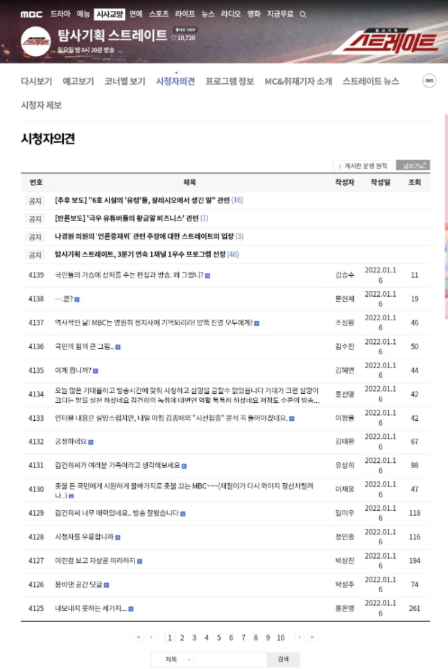 앞서 더불어민주당 인사들은 “MBC 스트레이트 본방사수”를 독려하며 홍보했지만, 방송이 끝난 후 시청자 게시판에는 “이게 뭐냐” “시청자 우롱하냐” “국민의 힘의 큰 그림이냐” "김건희씨 너무 매력 있네요...방송 잘 봤습니다" “이런 걸 자살골이라 한다”는 반응이 쏟아졌습니다.