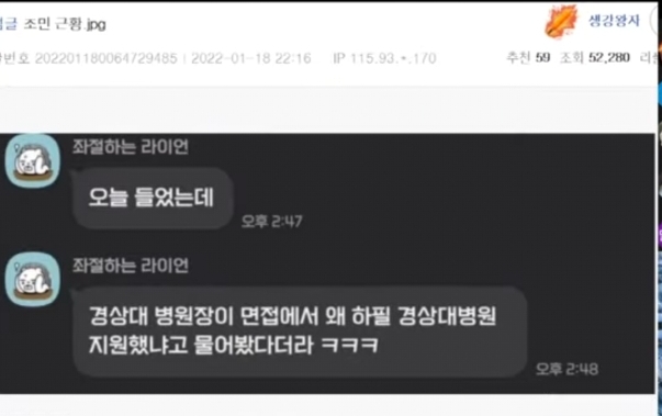 제보 내용은 "오늘 들었는데 경상대 병원원장이 면접에서 왜 하필 경상대 지원했냐고 물어봤다더라"는 내용이었습니다.