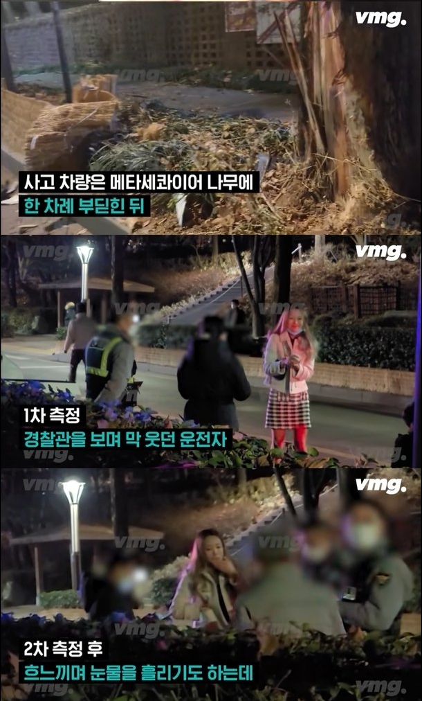 가로수를 두 차례 들이받고 멈춰 선 차에서 내린 서예진은 만취해 하이힐을 신은채 제대로 걷지도 못하는 상태였습니다. 그는 출동한 경찰관을 보며 웃기도 했는데 인도에 걸쳐진 벤츠 차량은 심한 충격으로 내부 에어백이 모두 터진 상태였습니다.