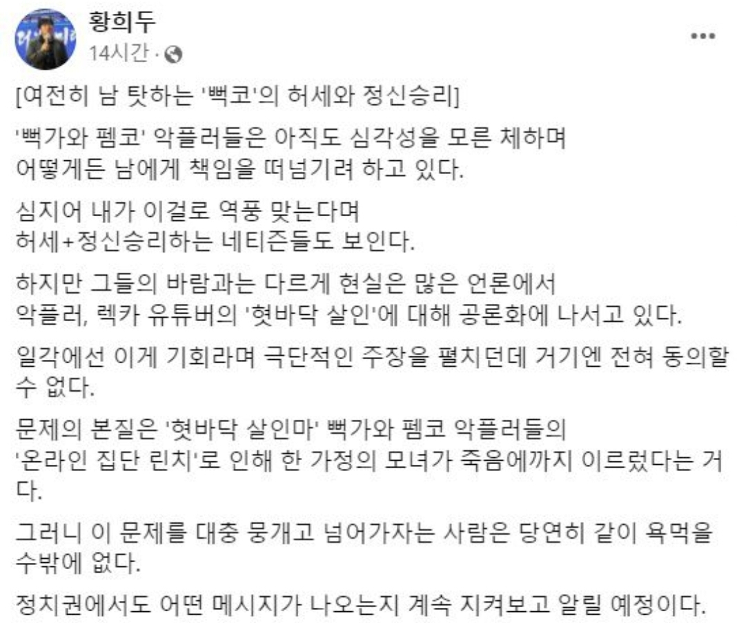 프로게이머 출신 황희두 민주연구원 이사는 이날 페이스북을 통해 “뻑가와 특정 커뮤니티 악플러들은 아직도 심각성을 모른 체하며 어떻게든 남에게 책임을 떠넘기려 하고 있다”며 “문제의 본질은 ‘혓바닥 살인마’ 뻑가와 커뮤니티 악플러들의 ‘온라인 집단 린치’로 인해 한 가정의 모녀가 죽음에까지 이르렀다는 것”이라고 지적했습니다.