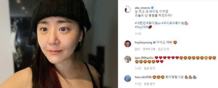 배우 문근영은 2월 9일 인의 인스타그램에 '눈뜨고 코베이징 이지만 오늘도 난 응원을 하겠드아!!'라는 글과 함께 셀카를 올렸습니다. 9일 있을 쇼트트랙 선수들을 응원하겠다는 메세지입니다.